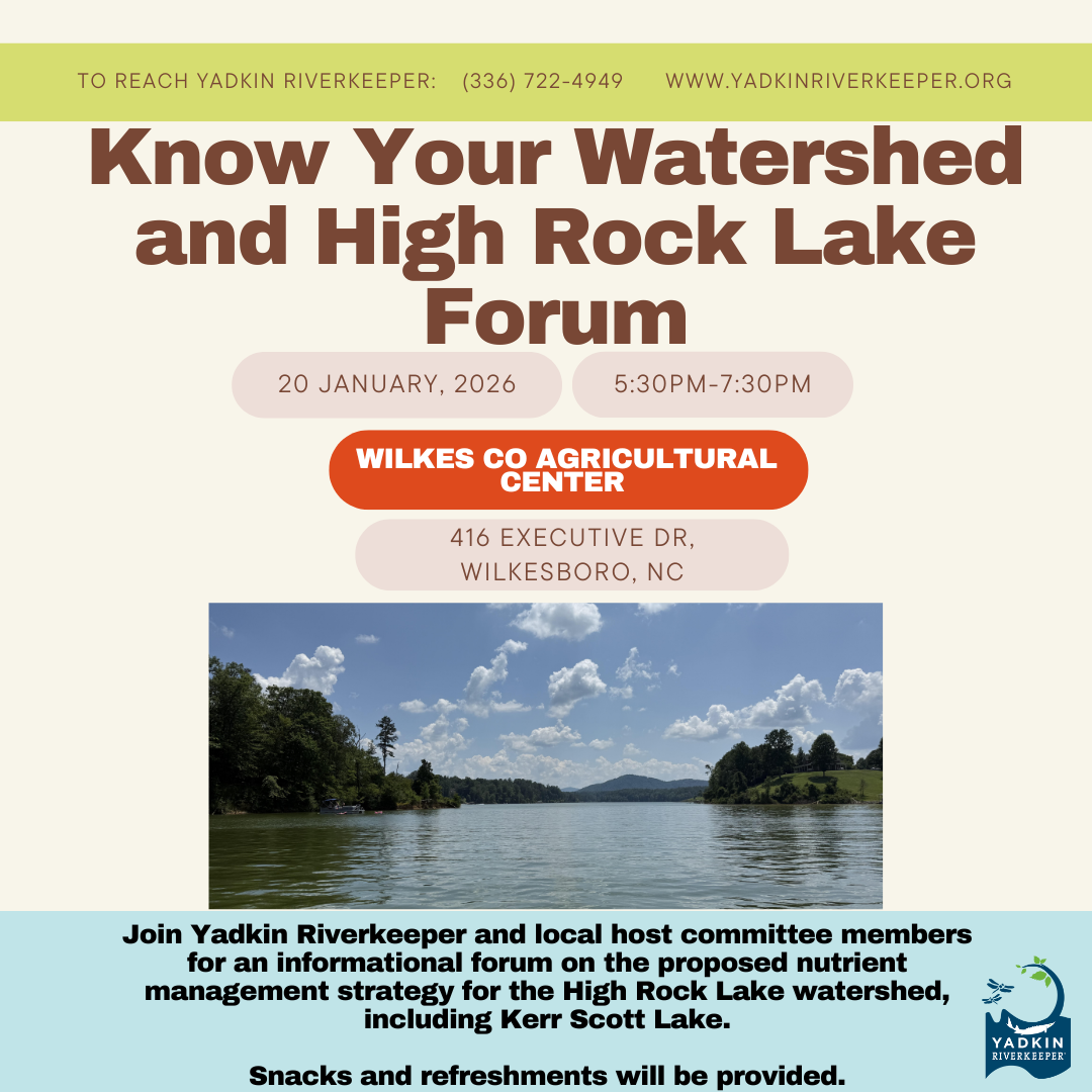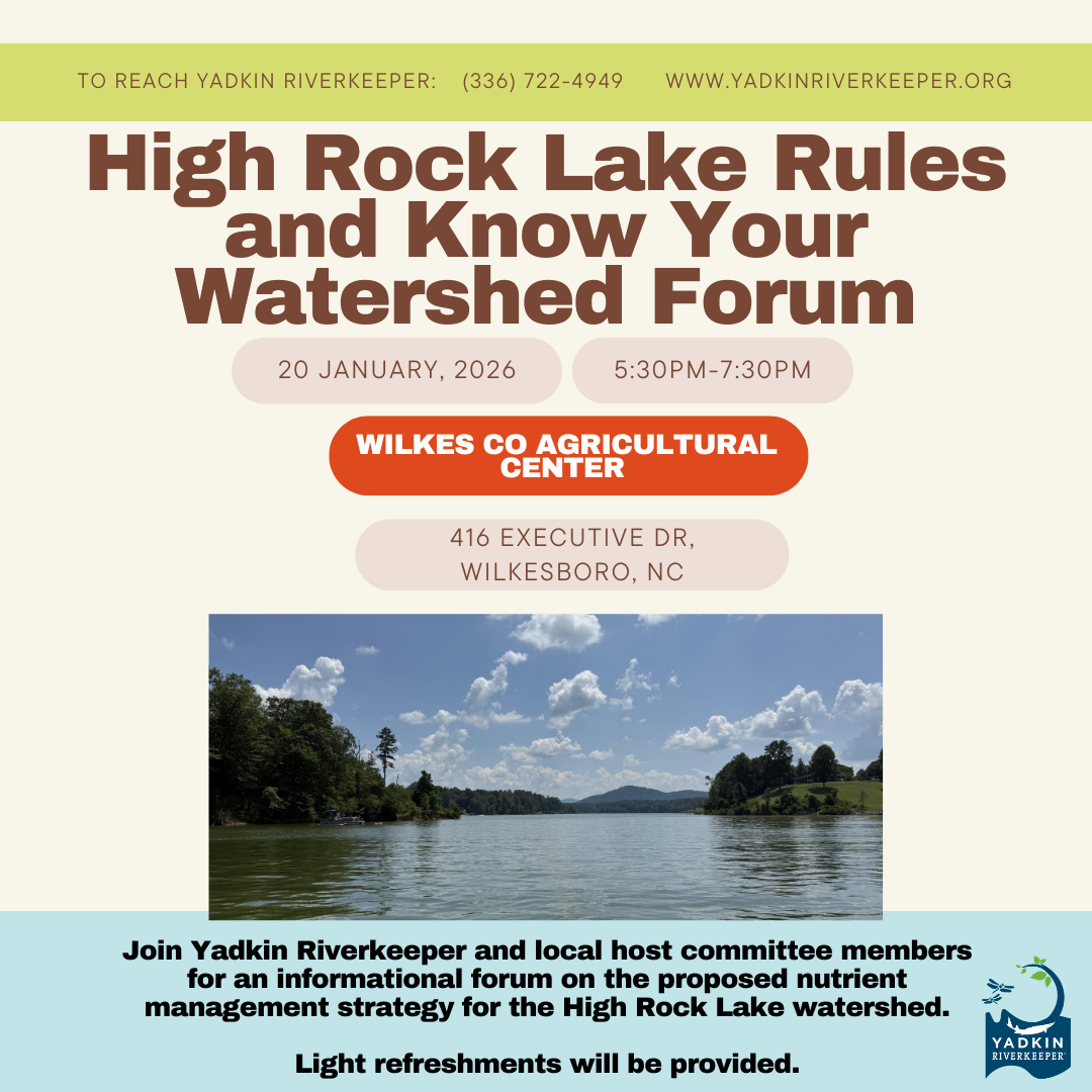 Yadkin Riverkeeper is hosting, with local steering committee members, a series of educational forums to discuss the High Rock Lake Rules, a state-led nutrient management strategy for the High Rock Lake watershed. Yadkin Riverkeeper will start with a "Know Your Watershed" presentation to provide some information about the current status of water quality in this part of the High Rock Lake watershed and watershed characteristics. Then, we will discuss the different components of the High Rock Lake Rules with dedicated time for questions from the public. Light refreshments will be provided. Hope to see you there!