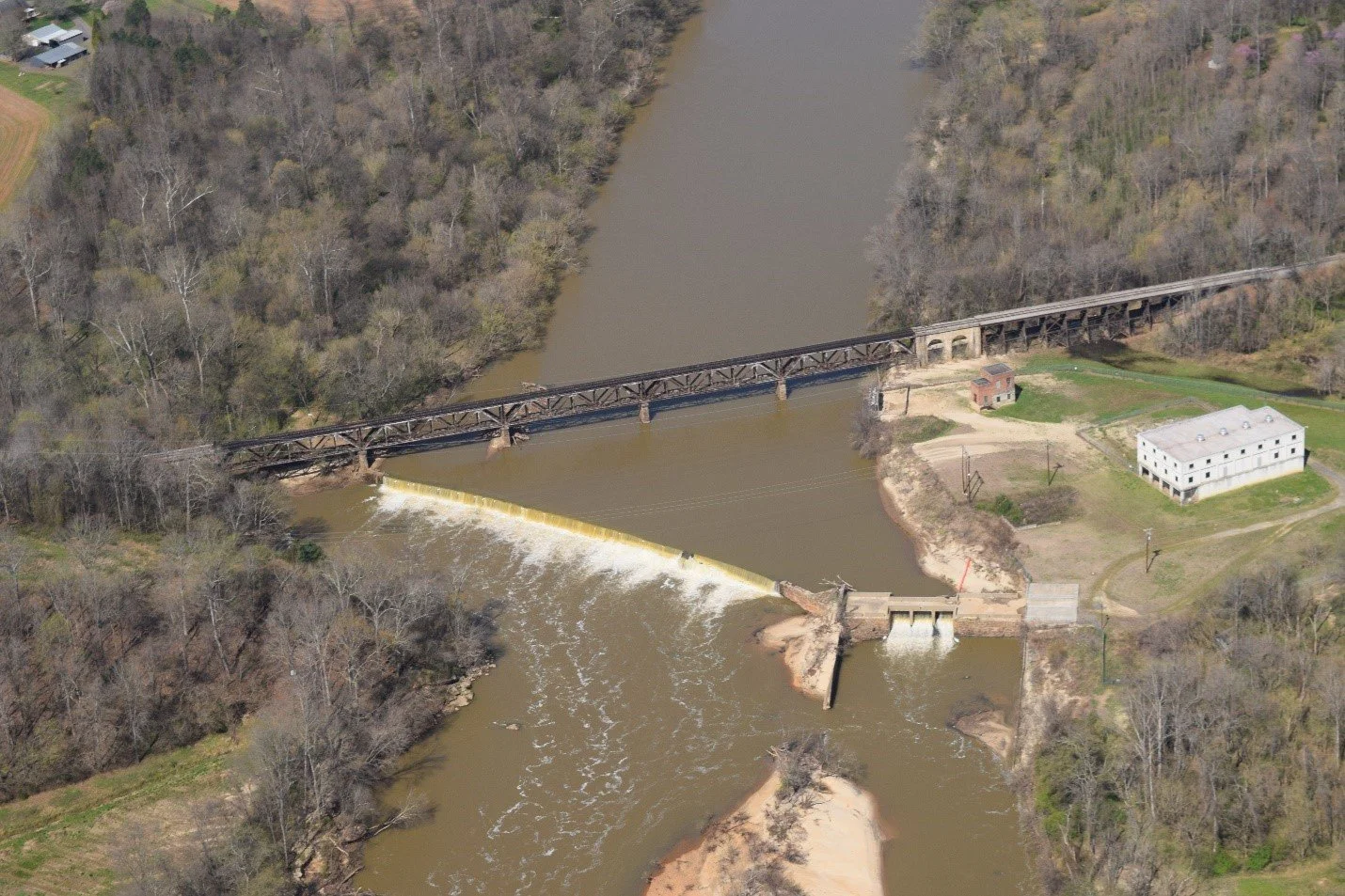 The historic Idols Dam, built in 1898, the first commercial hydroelectric dam in North Carolina. Yadkin River State Trail portage trail is at the left center of the photo and needs some improvement.