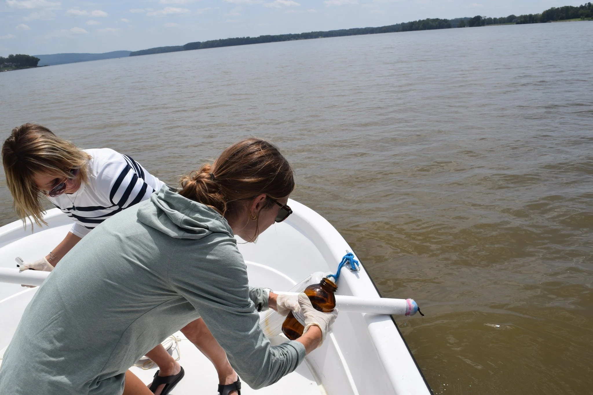 Stephanie presenting Yadkin Riverkeeper Edgar Miller with the "homemade" depth-integrated sampling device for collecting samples of water to be tested for chlorophyll-a from the "photic zone."