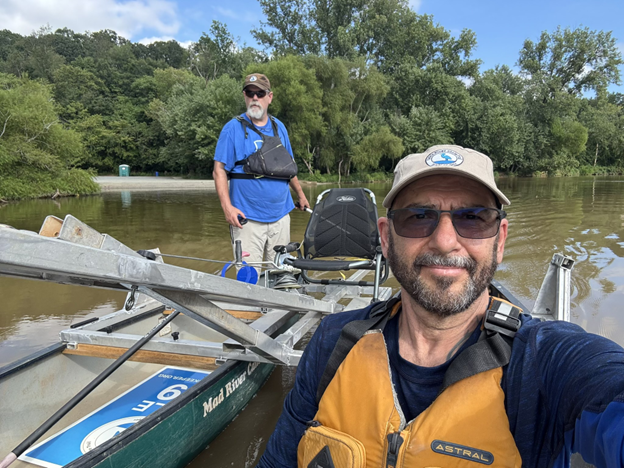 The Tire Puller quietly hums upstream through the thick air of an August late afternoon. I’m asking a lot from the little trolling motor to push two canoes with a sign, a U channel post, a post setter, and two people upstream 2.12 miles on the Yadkin River. We are looking for a specific spot on the Davidson County side to put Mile Marker 39. It’s Cube Hydro owned land, and this will be the third sign we are putting up with their permission today. Focused on the task at hand and evaluating the riverbank for opportunities to put up a sign, we were not paying attention to the lengthening shadows or the time.