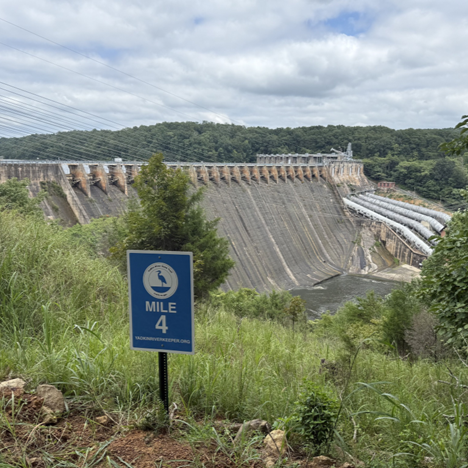 The next Mile Marker was meant to go somewhere along the Portage Trail at the Narrows Dam. I was hoping to put it up at the water’s edge and make a nice picture with the dam in the background. We picked up the path of orange blazes that marked the portage trail to the water. It’s set to be improved in the near future, but for now it's little more than a goat path strewn with the bones of deer. After lugging the supplies down to the water’s edge, we determined that the only part of the shoreline that wasn’t solid rock, was concrete. We lost a lot of time trying to make something work so that we wouldn’t have to carry it all back up the hill. Failing, we climb back up the goat path still loaded with our sign. Once we were back at the vehicle, we went to the top of the portage and found a spot for Mile Marker 4 along the Portage Trail that overlooks the Dam. We were told later that the Badin locals nickname for the Narrows dam is “#7” referring to how the dam looks from the previously open overlook (and popular spot for teenagers). Now these woods are tightly controlled by Cube Hydro and the State of North Carolina. The only way the public can visit this area without special permission is on the portage trail.