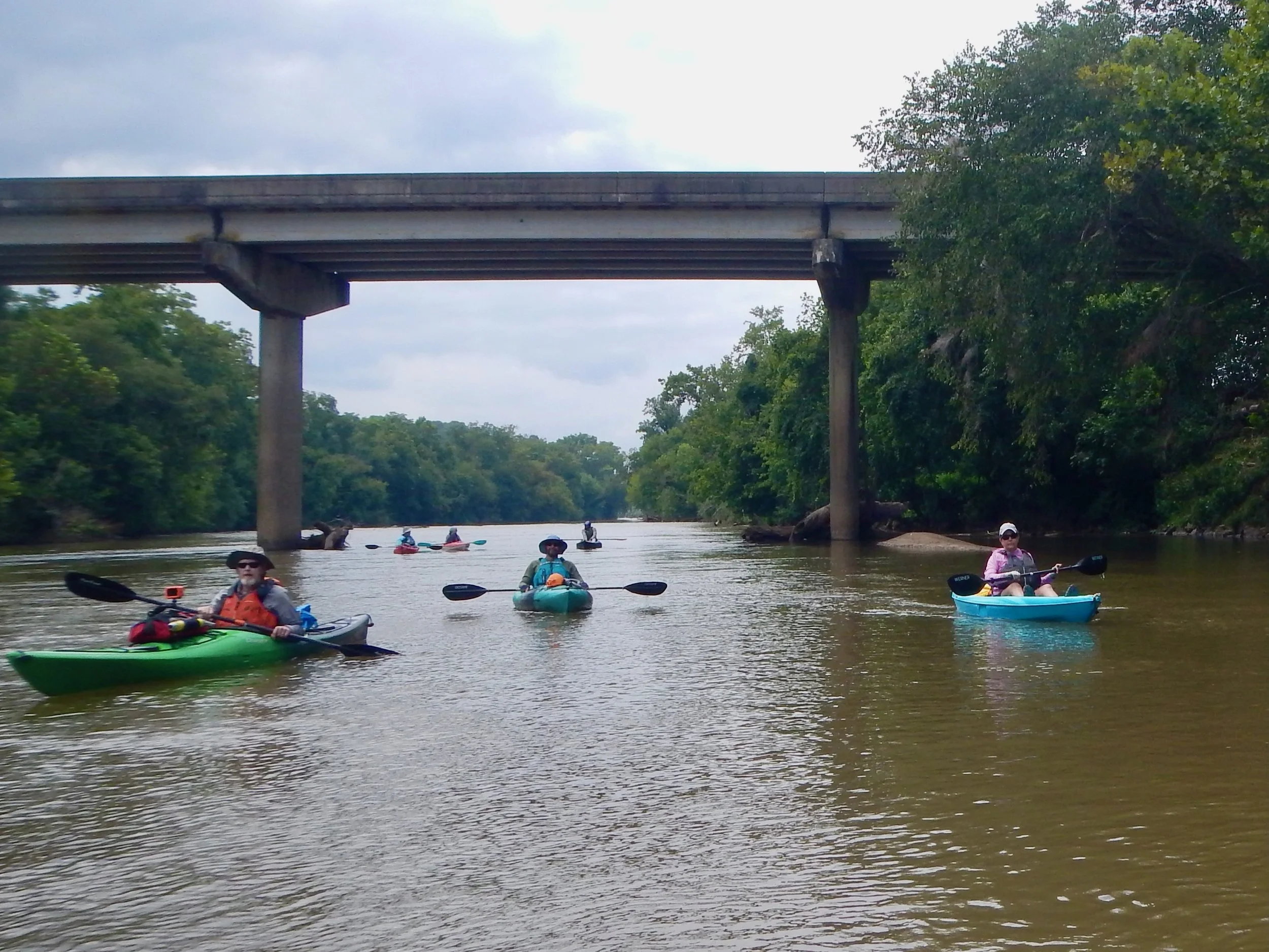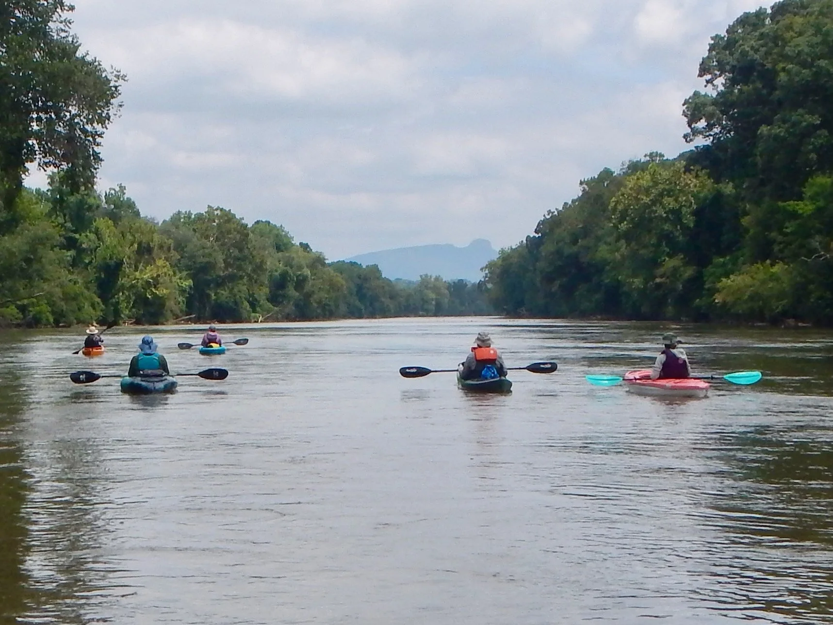 After a quick breakfast of oatmeal and bagels (I introduced the braver campers to my favorite grits and gravy), we loaded up and took a couple of vehicles up to Yadkin Shores. The stretch between Yadkin Shores and Shoals is the longest paddle on the Yadkin River State Trail without a public access. We stopped for breaks under the Rockford bridge and at the confluence of the Ararat River. It took about 8 hours or so to run this section. It was easy to enjoy the company as the miles slipped by. When I would look around to check in with my fellow paddlers they were almost always beside one or more other paddlers. There have been few groups of paddlers that have coalesced this quickly, but not many. As fun as the group was, the highlight in that section is the clear view of Pilot Mountain from the water.