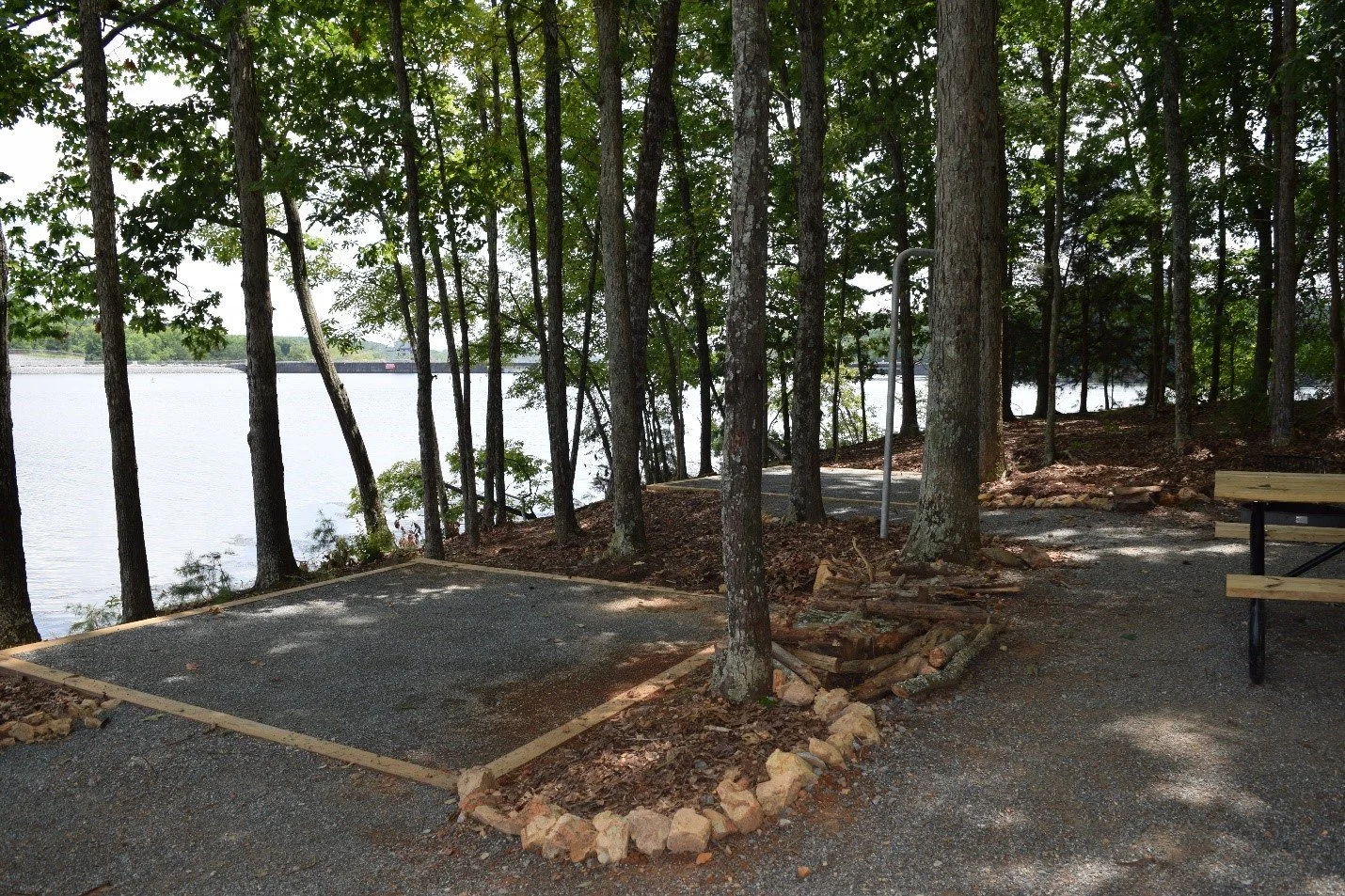 Two of the four new campsites on Tuckertown Reservoir. The dam can be seen in the background.