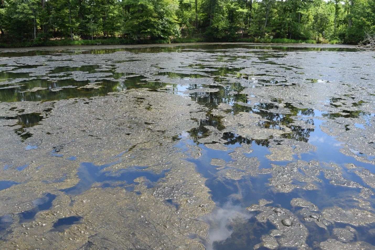 Noxious bloom of microseira wollei, or “black mat algae” on Tuckertown Reservoir.