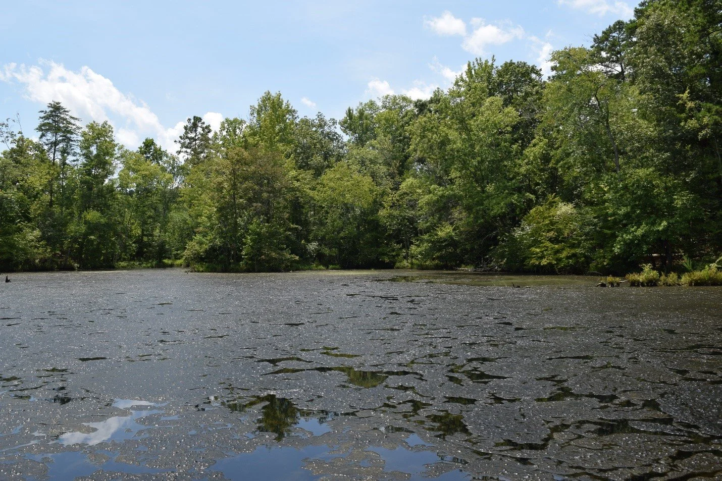 Microseira bloom near the city of Albemarle’s drinking water intake. The HAB can produce toxins that threaten drinking water supplies and drive-up treatment costs.