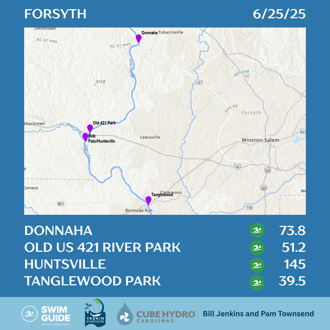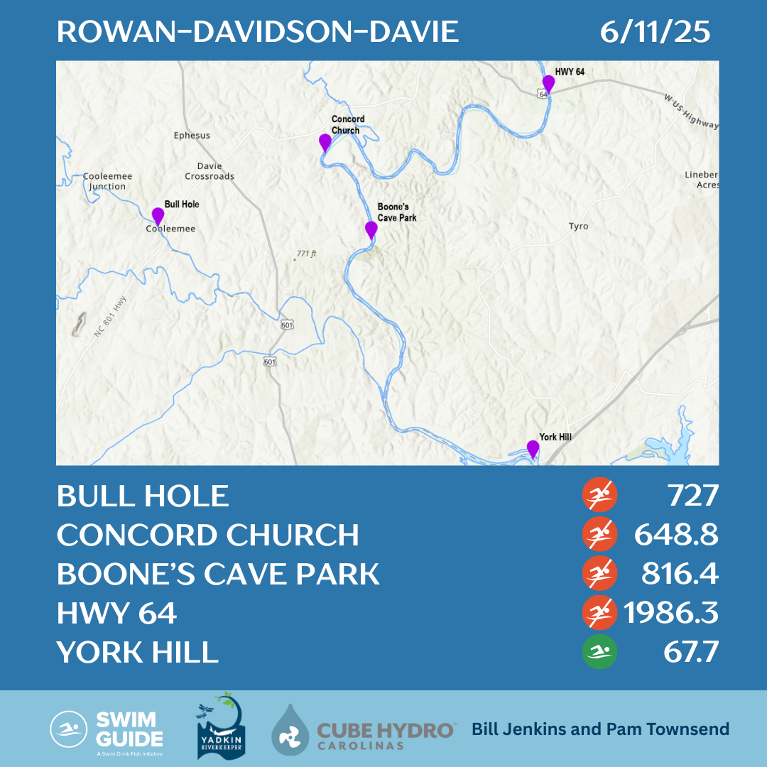 We have our Swim Guide results for this week on the Yadkin River and lakes. 14 out of 26 sites passed. The high frequency of rain events this summer is most likely contributing to elevated bacteria levels. Please be careful recreating and avoid sites with high levels of E. coli.