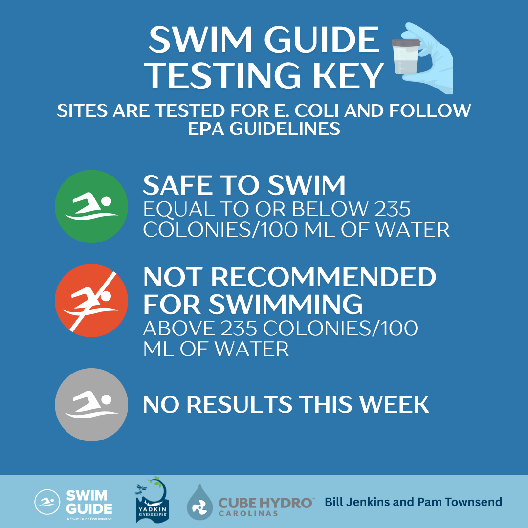 A big THANK YOU to all our sampling volunteers and to our Swim Guide sponsors- Cube Hydro Carolinas and Bill Jenkins & Pam Townsend!
